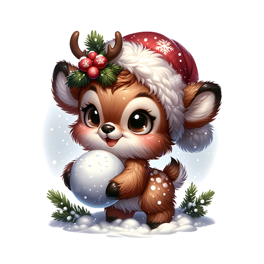 Un simpático reno de dibujos animados con un gorro de Papá Noel sostiene alegremente una bola de nieve, rodeado de nieve y vegetación festiva.