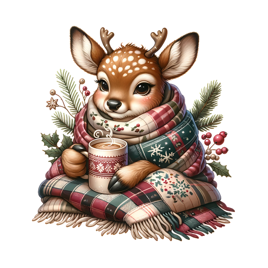 Un lindo ciervo envuelto en una colorida manta a cuadros, sosteniendo una bebida caliente, rodeado de follaje festivo y bayas.