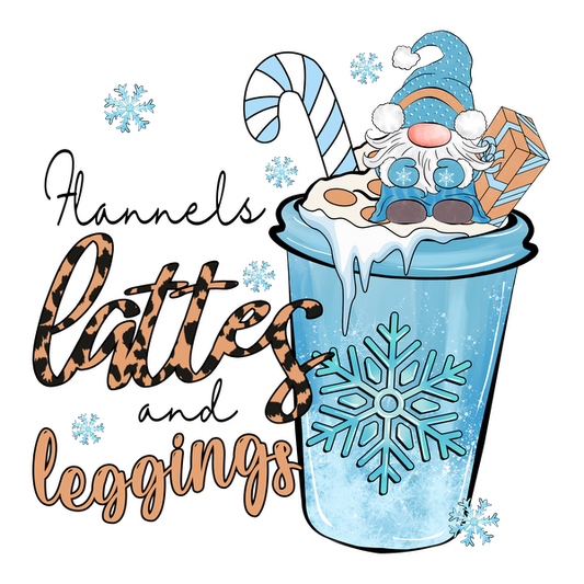 Lindos leggings con temática de café con leche que presentan un gnomo sobre una taza festiva, adornados con copos de nieve y un estilo festivo. ¡Perfectos para el invierno!