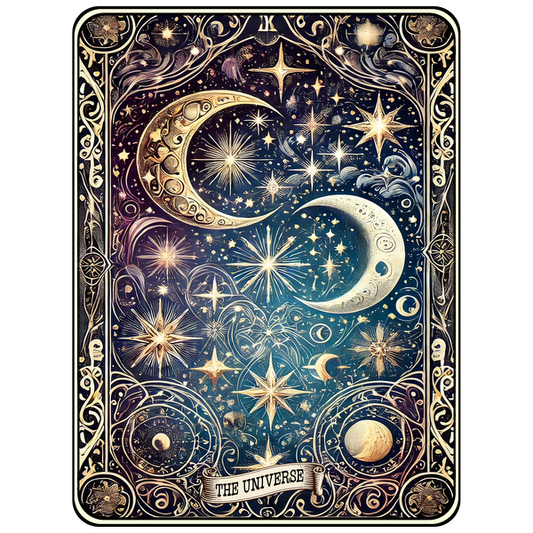 Una tarjeta bellamente ilustrada que presenta motivos celestiales de lunas, estrellas y planetas, mostrando el tema "El Universo" con intrincados detalles.