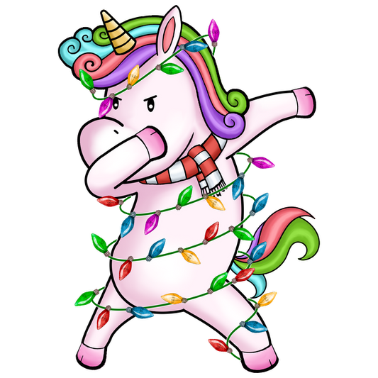 Un unicornio caprichoso, adornado con luces navideñas de colores y una bufanda de rayas, adopta una pose divertida y alegre.