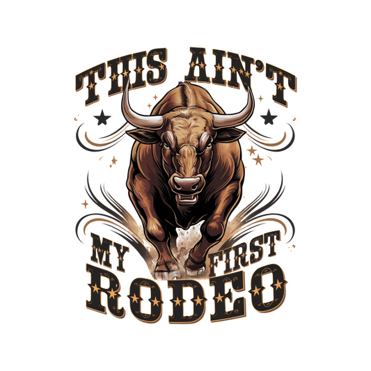 Un gráfico atrevido que presenta un toro cargando y la frase "Este no es mi primer rodeo", perfecto para los entusiastas del rodeo.