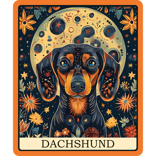Precio habitual A partir de £0.75 GBPPrecio habitualPrecio unitario / por£2.39 GBPPrecio de oferta A partir de £0.75 GBPUn vibrante retrato ilustrado de un perro salchicha rodeado de flores y estrellas, con un fondo de luna cósmica.