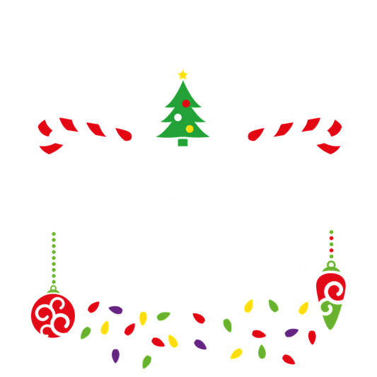 A fun and festive design featuring playful text proclaiming "Most Likely to Get Sassy with Santa," surrounded by holiday decorations.DTF Transfers heat press transfersdtf regular iron