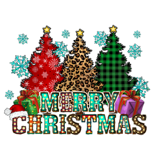 Celebrate the festive season with this vibrant "Merry Christmas" design featuring colorful trees, snowflakes, and wrapped gifts!DTF Transfers heat press transfersdtf regular iron