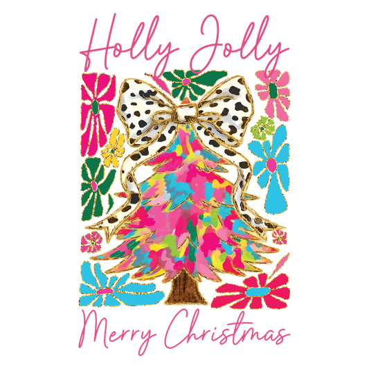 Brighten your holiday spirit with this colorful "Holly Jolly Merry Christmas" design featuring a vibrant Christmas tree and playful floral accents!DTF Transfers