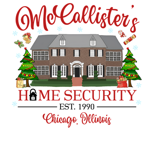 Celebrate the holidays with a festive illustration featuring a cozy house, Christmas trees, and cheerful decorations from McCallister's Home Security!DTF Transfers dtf transfers dtf prints
