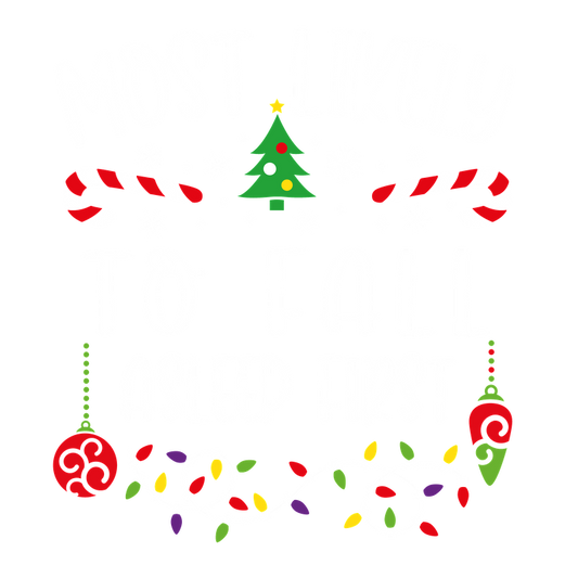 A festive graphic featuring the playful phrase "Most Likely to Fall Asleep First," adorned with Christmas trees, candy canes, and colorful lights.DTF Transfersdtf regular iron dtf transfers