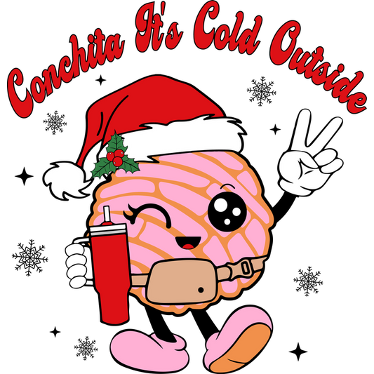 A cheerful cartoon character wearing a Santa hat, holding a drink, with the text "Conchita It's Cold Outside" above it.DTF Transfersdtf regular iron