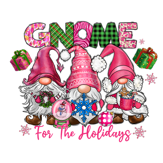 Celebrate the holidays with this cheerful illustration of gnomes in festive hats, surrounded by gifts and winter decorations!DTF Transfers heat press transfers heat press transfers