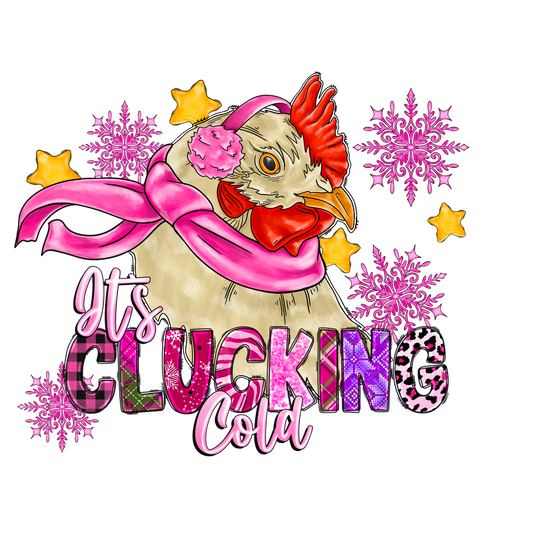 A whimsical illustration of a chicken wearing a scarf and earmuffs, paired with the playful phrase "It's Clucking Cold" in vibrant colors.DTF Transfers dtf transfers dtf prints