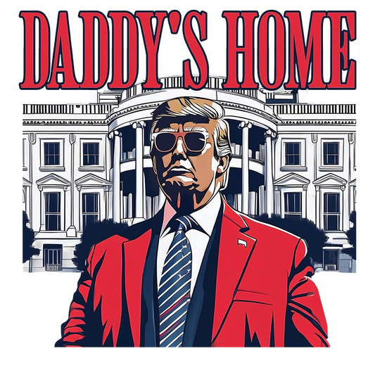A bold graphic design featuring a man in a red suit, set against the White House, with the caption "DADDY'S HOME."DTF Transfersdtf regular irondtf regular iron