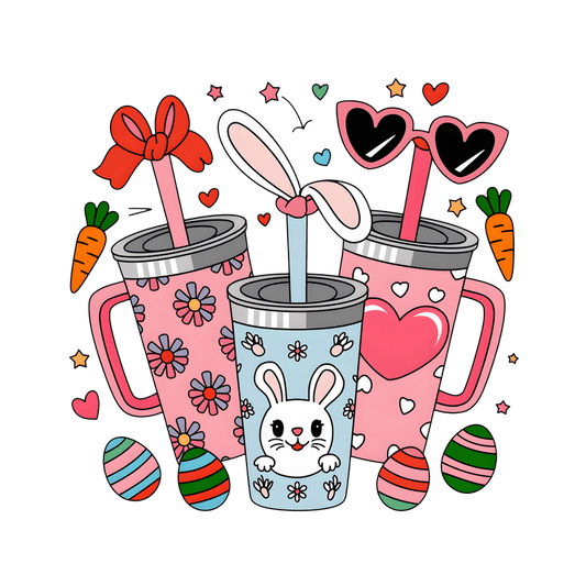 A cheerful illustration of three colorful drinks adorned with cute bunny and floral designs, surrounded by Easter eggs and playful elements.DTF Transfers