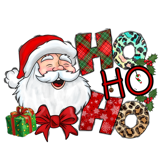 A festive design featuring Santa, bold "HO HO HO" letters in various patterns, and colorful holiday gifts adorned with bows.DTF Transfersdtf regular iron