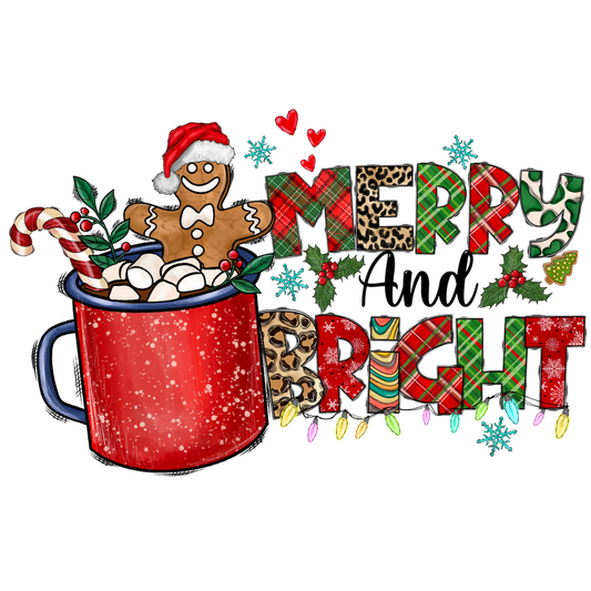 A festive design featuring a red mug with marshmallows and a gingerbread man, decorated with "Merry Bright" in colorful letters.DTF Transfersdtf regular iron
