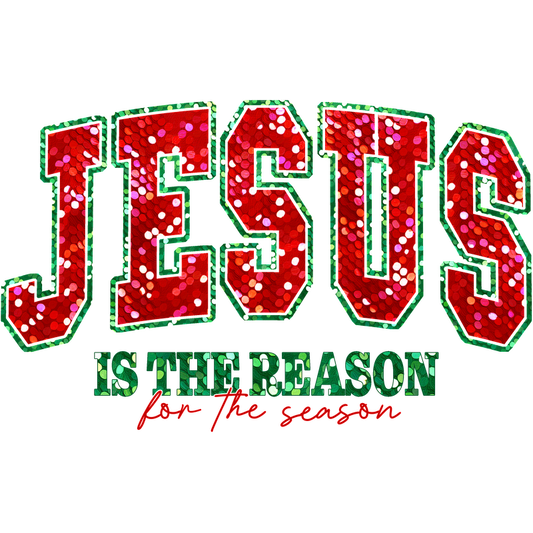 Celebrate the season with this vibrant, sparkling graphic proclaiming "Jesus is the Reason," adorned in festive red and green!DTF Transfers