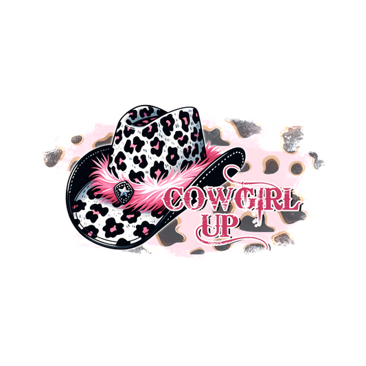 Un elegante sombrero de vaquera con estampado de leopardo rosa adornado con plumas y la pegadiza frase "COWGIRL UP".