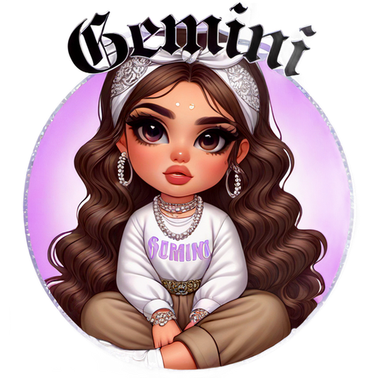 Precio habitual A partir de £0.75 GBPPrecio habitualPrecio unitario / por£2.39 GBPPrecio de oferta A partir de £0.75 GBPUna linda y estilizada ilustración de una niña que representa a Géminis, con cabello largo ondulado y accesorios elegantes sobre un fondo vibrante.