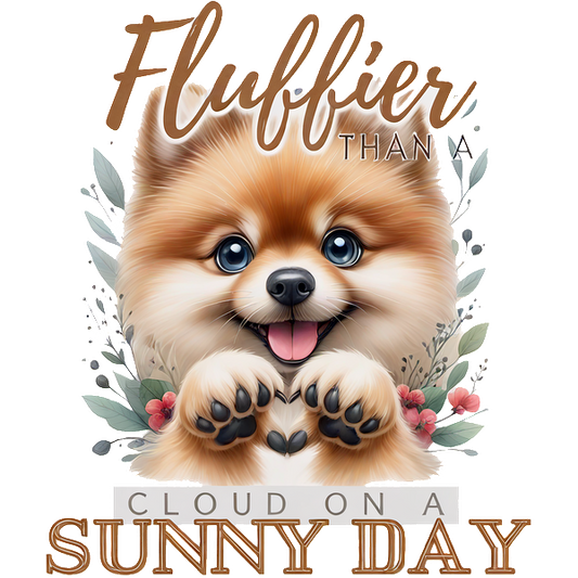 Adorable ilustración de un cachorro de Pomerania esponjoso con una expresión alegre, rodeado de flores y un lema divertido.