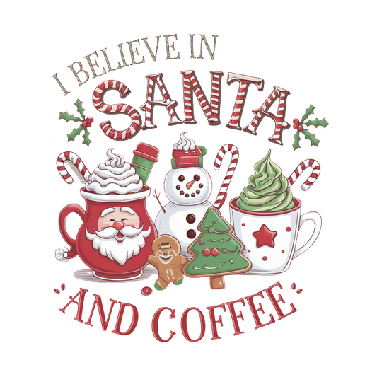 Gráfico festivo que presenta a Papá Noel, tazas de café, un muñeco de nieve, un hombre de jengibre y un árbol de Navidad con elementos divertidos.