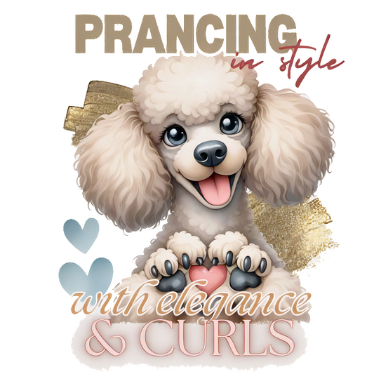 Una ilustración alegre y estilizada de un caniche con rizos esponjosos, con un texto divertido sobre elegancia y estilo.