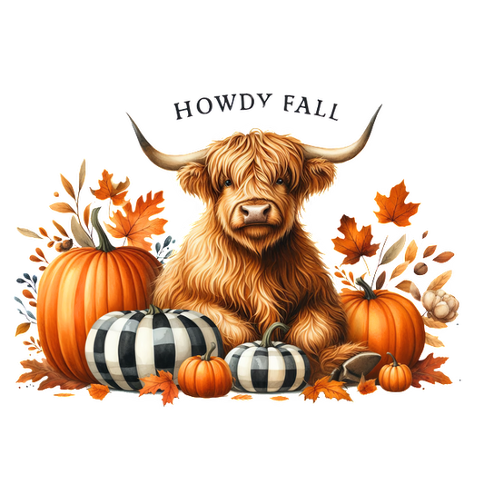 Una encantadora ilustración que presenta una vaca de las Highlands rodeada de calabazas otoñales y hojas coloridas, con "Howdy Fall" encima.