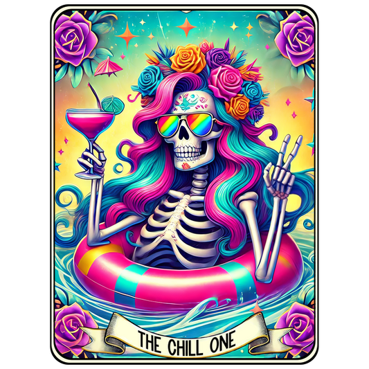 Precio habitual A partir de £0.75 GBPPrecio habitualPrecio unitario / por£2.39 GBPPrecio de oferta A partir de £0.75 GBPUna obra de arte vibrante que presenta un esqueleto colorido relajándose en una piscina con una bebida tropical, adornado con flores y gafas de sol.