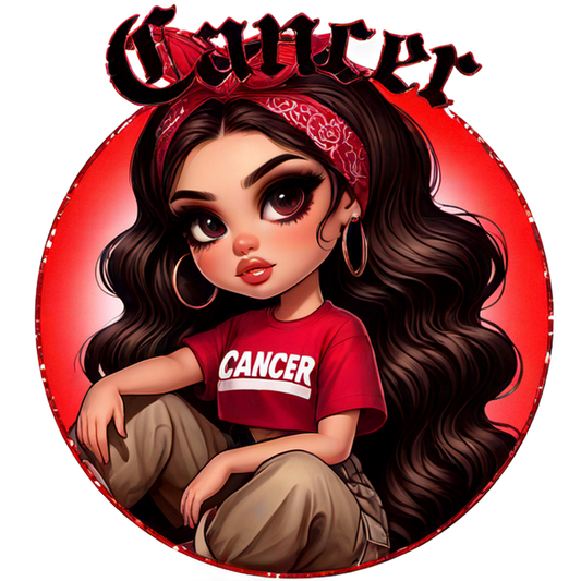 Precio habitual A partir de £0.75 GBPPrecio habitualPrecio unitario / por£2.39 GBPPrecio de oferta A partir de £0.75 GBPUna elegante ilustración de una chica con cabello largo, vestida con una camiseta roja con la palabra "CÁNCER" y un pañuelo, y que irradia confianza.