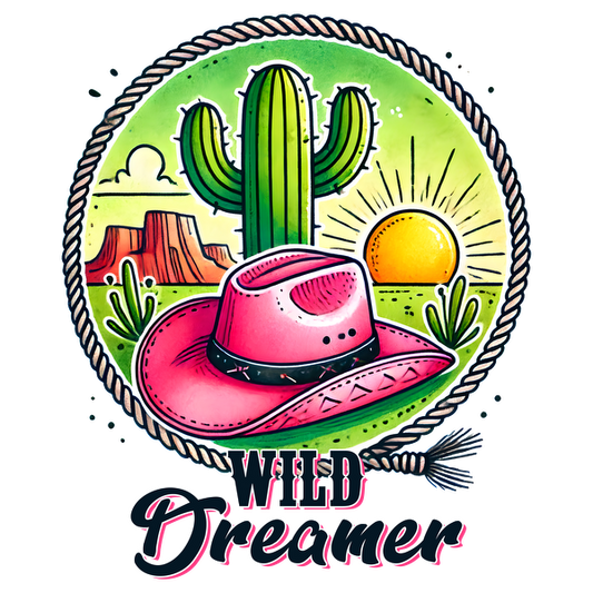 Un diseño vibrante que presenta un sombrero de vaquero rosa, un cactus, montañas y un sol, rodeados por una cuerda con el texto "Wild Dreamer".