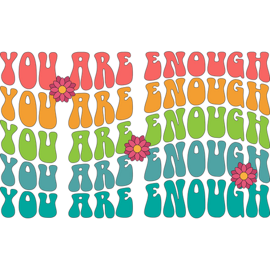 Un diseño vibrante que presenta el mensaje alentador "Eres suficiente" en una tipografía colorida y divertida con flores.