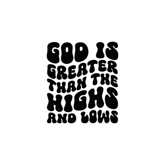 Un diseño gráfico audaz e inspirador que presenta la frase "Dios es más grande que los altos y los bajos" en una tipografía divertida.