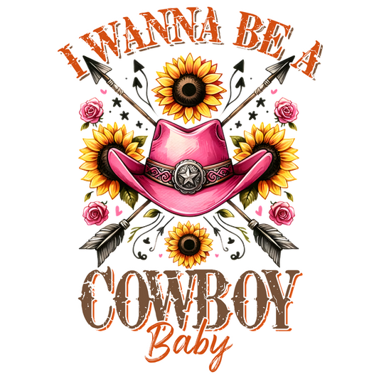 Este diseño vibrante presenta un sombrero de vaquero rosa rodeado de girasoles y flechas, con la divertida frase "Quiero ser un bebé vaquero".