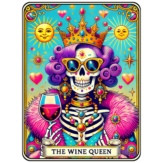 Precio habitual A partir de £0.75 GBPPrecio habitualPrecio unitario / por£2.39 GBPPrecio de oferta A partir de £0.75 GBPUna ilustración vibrante y caprichosa de "La Reina del Vino", que presenta un esqueleto coronado que sostiene una copa de vino, rodeado de motivos solares.