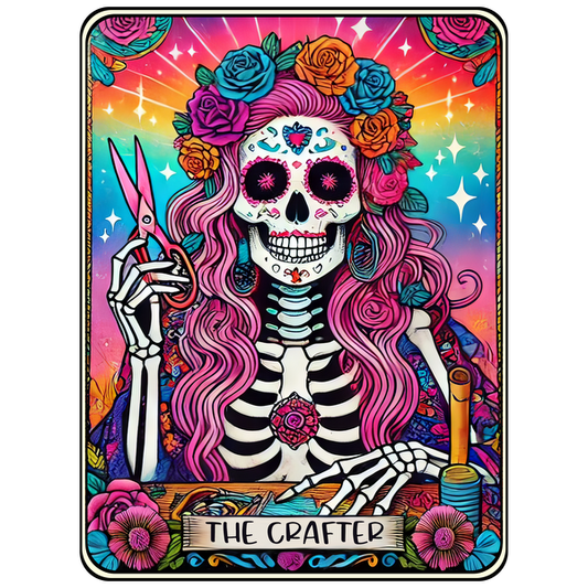 Precio habitual A partir de £0.75 GBPPrecio habitualPrecio unitario / por£2.39 GBPPrecio de oferta A partir de £0.75 GBPUna ilustración vibrante y colorida de un esqueleto llamado "El Artesano", adornado con flores, sosteniendo tijeras entre herramientas de artesanía.