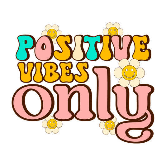 Gráfico brillante y alegre que presenta la frase "Positive Vibes Only" adornada con flores sonrientes y letras divertidas.