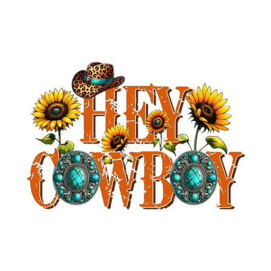 Un diseño vibrante "Hey Cowboy" con girasoles, un sombrero con estampado de leopardo y detalles decorativos en turquesa para un ambiente western divertido.