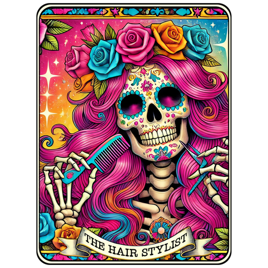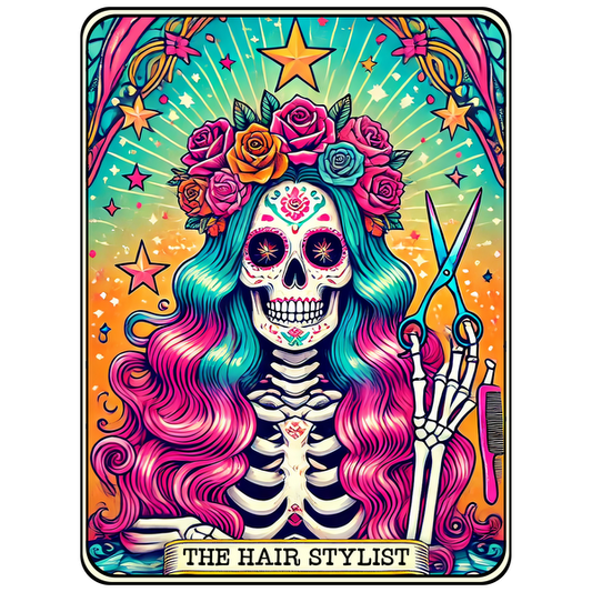 Precio habitual A partir de £0.75 GBPPrecio habitualPrecio unitario / por£2.39 GBPPrecio de oferta A partir de £0.75 GBPUna ilustración vibrante y colorida presenta a un peluquero esqueleto con una corona de flores, sosteniendo tijeras y mostrando un llamativo cabello rosa y azul.