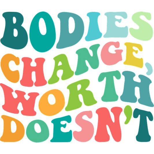 Un diseño vibrante y colorido que presenta el mensaje "Los cuerpos cambian, el valor no", celebrando la positividad y la aceptación corporal.