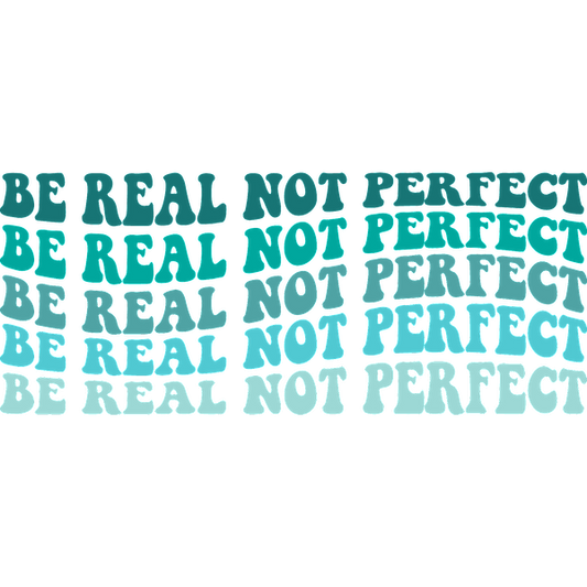 Un diseño motivacional que presenta la frase "Sé real, no perfecto", repetida en varias fuentes llamativas y coloridas.