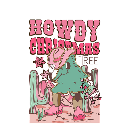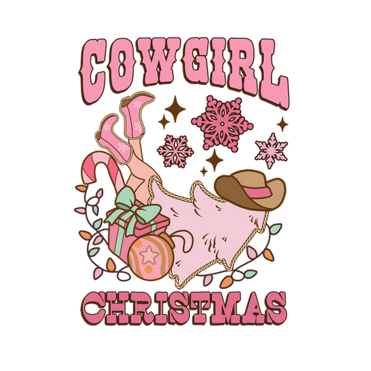 ¡Celebre la temporada con este divertido diseño "Navidad de vaquera" que incluye elementos festivos como copos de nieve, regalos y botas de vaquero rosas!