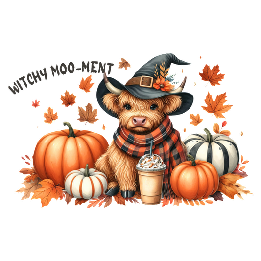 Precio habitual A partir de £0.75 GBPPrecio habitualPrecio unitario / por£2.39 GBPPrecio de oferta A partir de £0.75 GBPUna linda vaca de las Highlands con un sombrero de bruja y una bufanda está sentada entre calabazas y hojas de otoño, disfrutando de una bebida inspirada en el otoño.