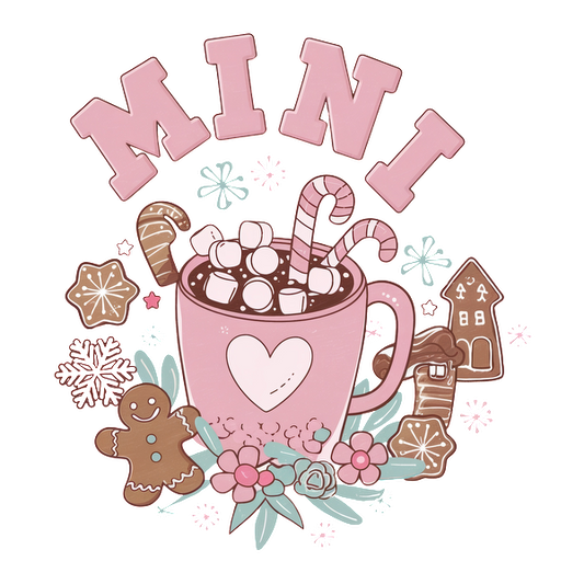 Una divertida taza rosa llena de chocolate caliente, malvaviscos y bastones de caramelo, rodeada de pan de jengibre festivo y copos de nieve.