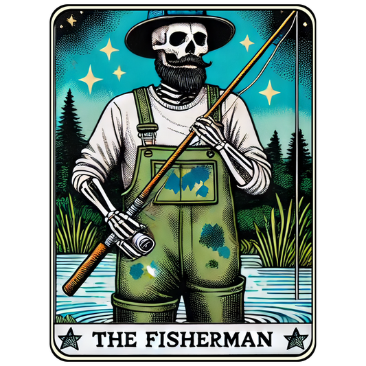 Precio habitual A partir de £0.75 GBPPrecio habitualPrecio unitario / por£2.39 GBPPrecio de oferta A partir de £0.75 GBPUna colorida ilustración de un pescador esquelético con un mono verde, sosteniendo una caña de pescar frente a un fondo natural vibrante.