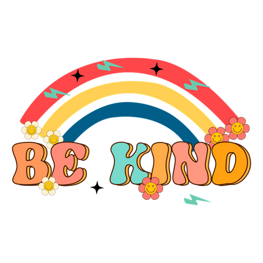 Diseño colorido "Be Kind" que presenta un alegre arcoíris y flores felices, promoviendo un mensaje positivo y amigable.