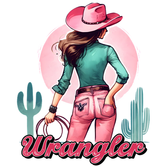 Una vaquera elegante con un sombrero rosa y jeans ajustados, sosteniendo un lazo, encarna el espíritu Wrangler con el desierto como telón de fondo.