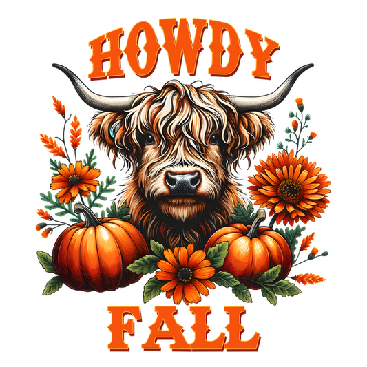 Celebre el otoño con este diseño vibrante que presenta una vaca de las Highlands, calabazas y flores alegres, todo adornado con "Howdy Fall".