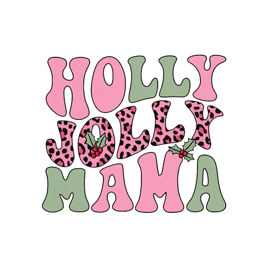 Un diseño caprichoso que presenta la divertida frase "Holly Jolly Mama" en rosa y verde vibrantes con un divertido estampado de leopardo.