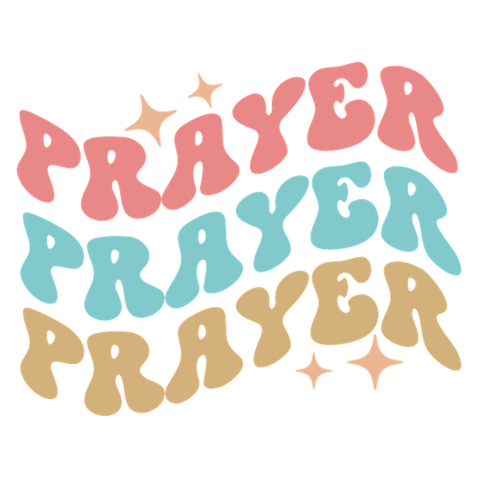 Diseño gráfico divertido que presenta la palabra "PRAYER" en colores vibrantes de inspiración retro con extravagantes acentos de estrellas.