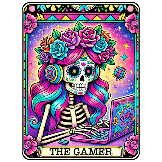 Precio habitual A partir de £0.75 GBPPrecio habitualPrecio unitario / por£2.39 GBPPrecio de oferta A partir de £0.75 GBPUna ilustración colorida y vibrante de una niña esqueleto con auriculares jugando en una computadora portátil, rodeada de flores.