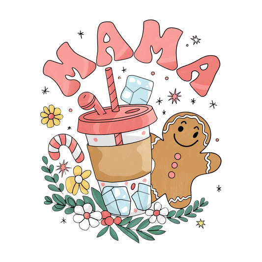 Una ilustración caprichosa de una bebida festiva y una galleta de jengibre con la palabra "MAMA" rodeada de flores y bastones de caramelo.